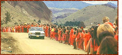 By 1981, Rajneesh had settled with many of his followers at the Oregon retreat called Rajneeshpuram, where the guru relaxed between discourses and shakti dispensations by tooling around in his 93 Rolls-Royces, waving to throngs of orange-clad disciples. The cult incorporated itself as a city, and then the guru’s chief lieutenants began making brazen moves to consolidate regional political power near the tiny, beleaguered village of Antelope. Beginning with voter fraud, these machinations culminated in mass poisoning and assassination plots in which the Bhagwan’s complicity was murky. He was either a dissociated sociopath or the worst city manager imaginable. The end result was his attempted flight from US immigration charges in 1985. Forced to land his two Learjets for refueling in Charlotte, NC