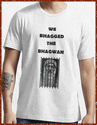 — my place of birth — the guru was caught at the airport by the FBI. An art professor at my alma mater, UNC-Charlotte, made a small fortune selling t-shirts with the legend WE BHAGGED THE BHAGWAN (a version of which is still for sale today).