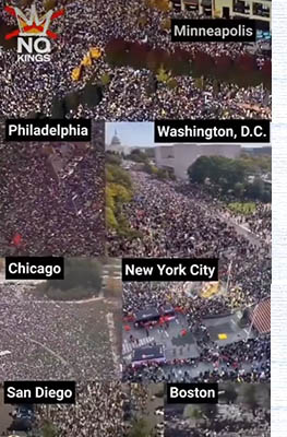 On October 28 2025, an estimated eight million Americans gathered in over 3200 cities and towns for the "No Kings" protest against the administration of Donald Trump. It was the largest one-day protest in American history, and remarkably peaceful in view of the strong feelings that the increasingly unpopular President engenders on all sides. And it signaled the continued growth of a growing and substantial activist resistance — not just to the political dangers that the current administration represents, but to the fearful, pain-wracked state of mind driving its politics.